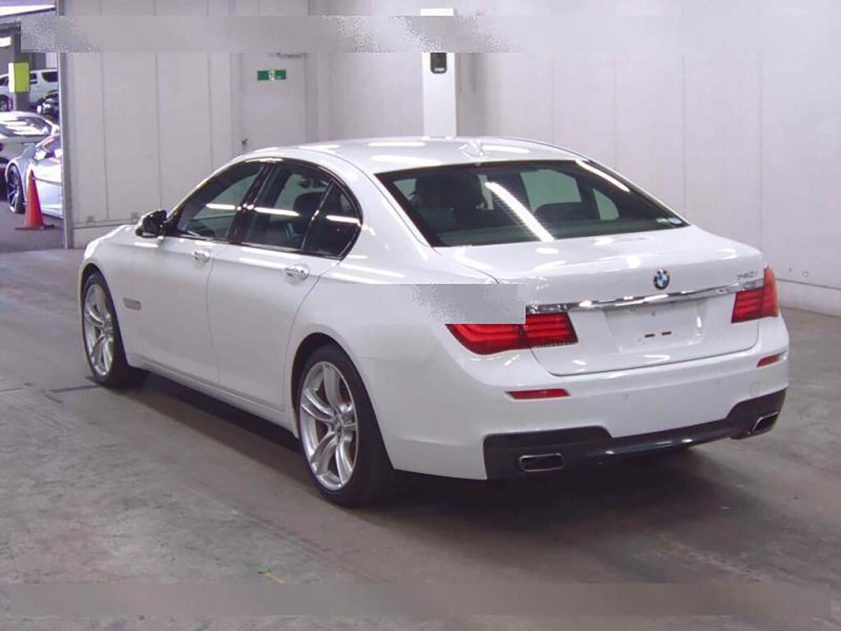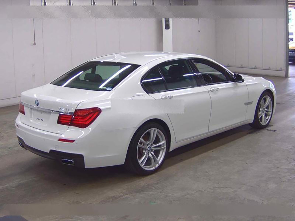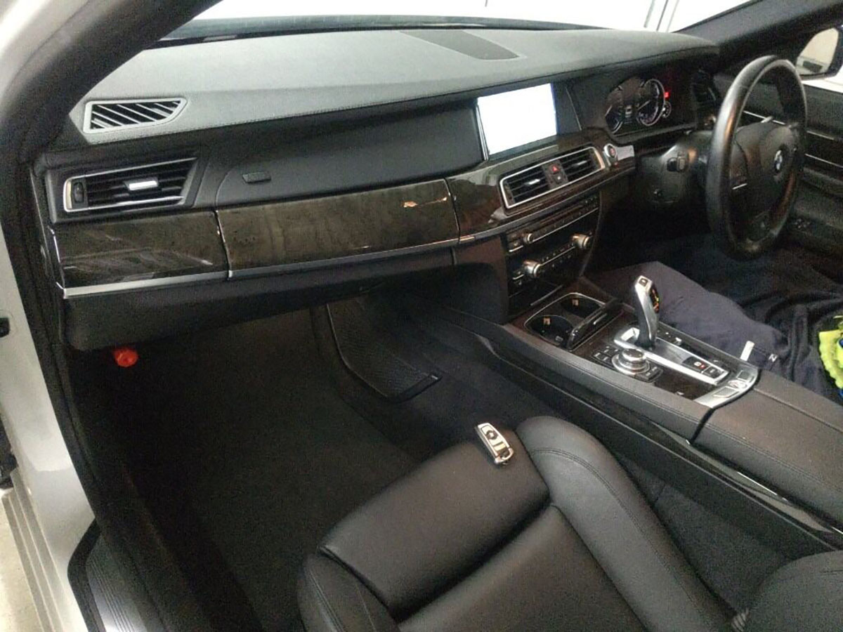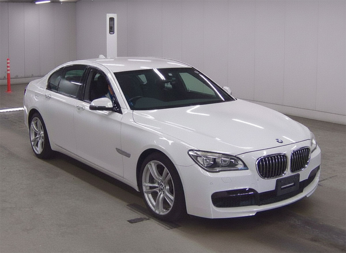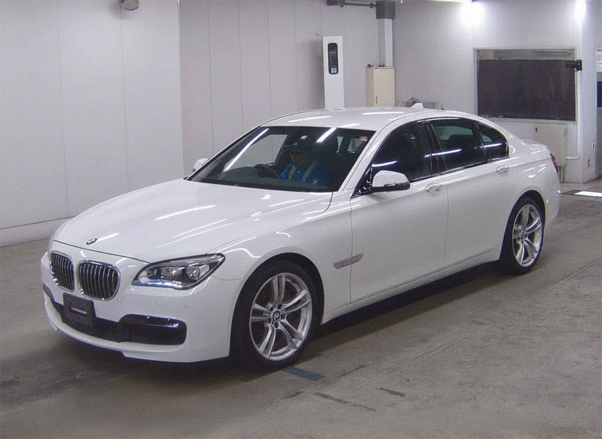 This 2014 BMW 740i is a right-hand-drive, Japanese-market executive sedan finished in Alpinweiss 3 over a Black Dakota leather interior. Power is provided by a 3.0-liter "N55" turbocharged inline-6, which sends 320 horsepower to the rear wheels through an automatic transmission.